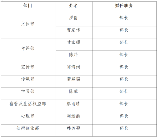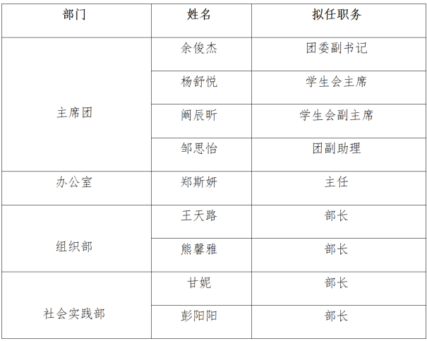 根据《太阳成集团tyc5392025-2026 学年度太阳成集团tyc539学生干部换届工作实施方案》,经个人申请、院部推荐、公平竞选、民主评议、太阳成集团tyc539综合各方意见研究决定,拟聘任以下同学担任2025-2026学年度太阳成集团tyc539团委学生会部门负责人: