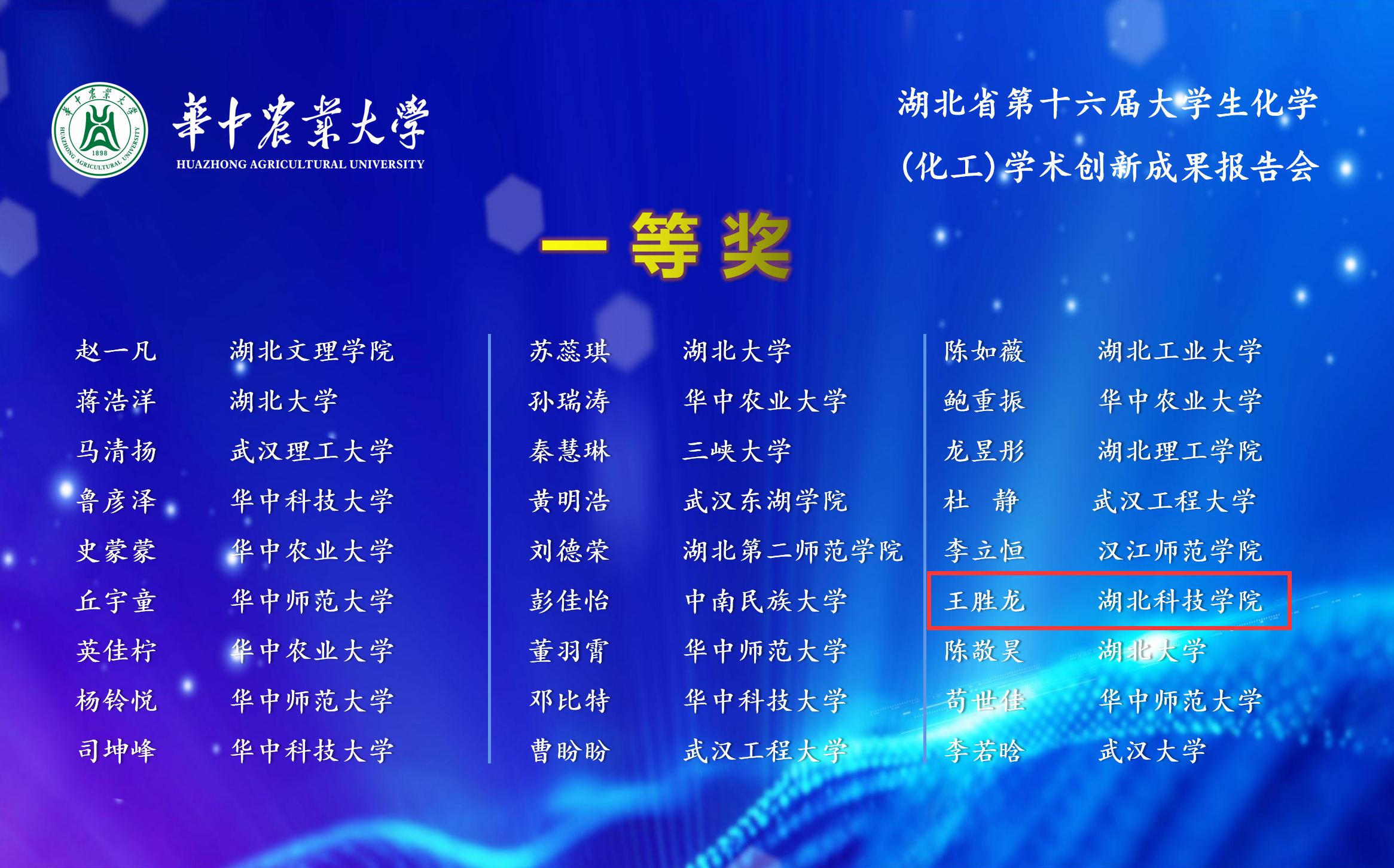 (通讯员:熊俊、方儒)由湖北省化学化工学会主办、华中农业大学(本科生院、理学院)承办的湖北省第十六届大学生化学(化工)学术创新成果报告会于2023年5月13日至5月14日在华中农业大学举行,我校学子在湖北省第十六届化学(化工)学术创新成果报告会上取得优异成绩。