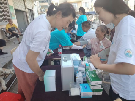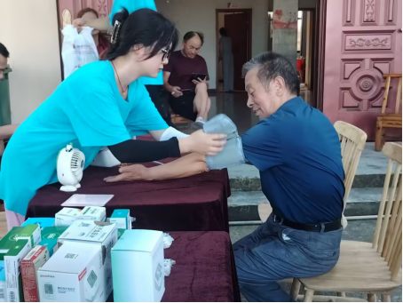 发挥专业所长,健康义诊暖人心。顶着炎炎烈日,团队在村内设立了临时义诊点,免费为村民提供血压测量服务。队员们操作规范,认真记录每一位村民的测量数据,并根据结果提供个性化的健康建议,如提醒高血压患者注意低盐饮食、规律作息和按时服药。队员们汗流浃背却专注投入的身影,赢得了村民们的广泛赞誉。