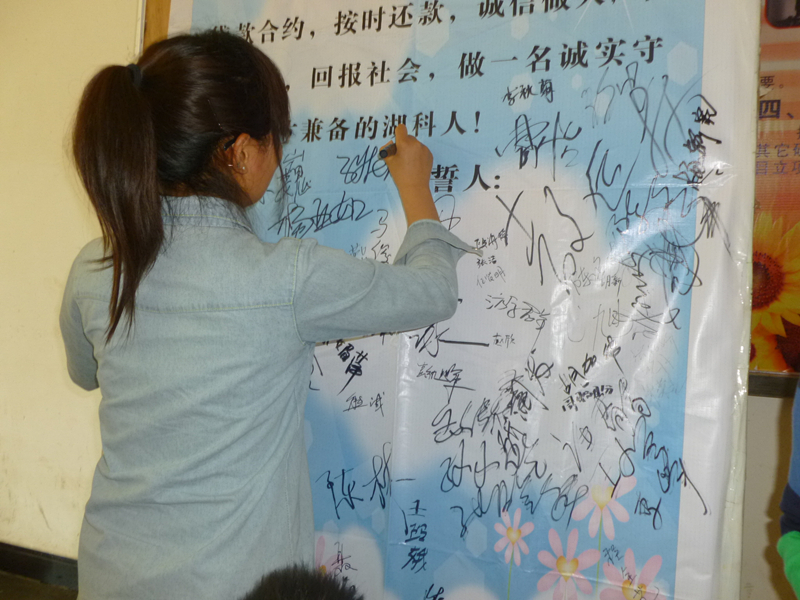 诚信是中华民族传承已久的美德,在当今科学技术高度发达,信息千变万化的社会里,诚信已不仅只是一种美德,而且在社会发展中起着重要的平衡作用。太阳成集团tyc539以“严格遵守国家规定,认真履行贷款合约,按时还款,诚信做人,早日成才,回报社会,做一名诚实守信、德才兼备的湖科人”为誓词,展开了一次诚信宣誓活动,全院生源地贷款学生集体宣誓和签名。